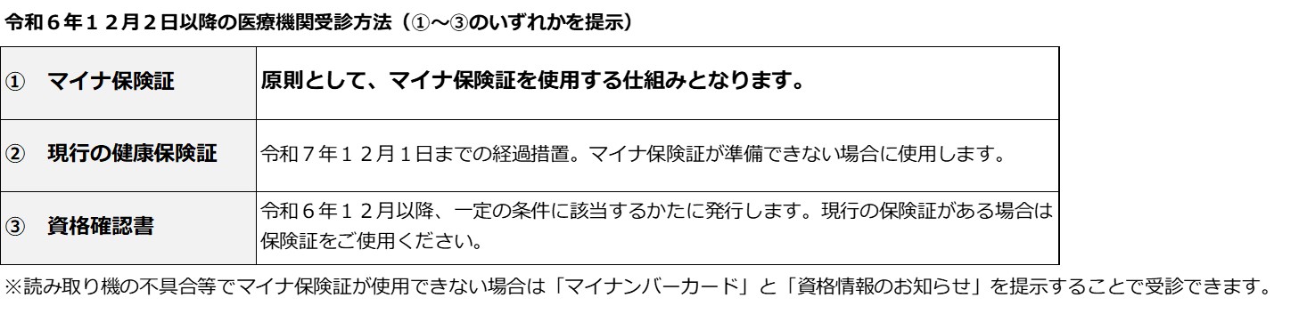 令和6年12月2日以降、新規で保険証は発行されません。お手元にある有効な保険証については、新規発行廃止後も最長1年間、従来通り使用できるよう、経過措置が設けられます。